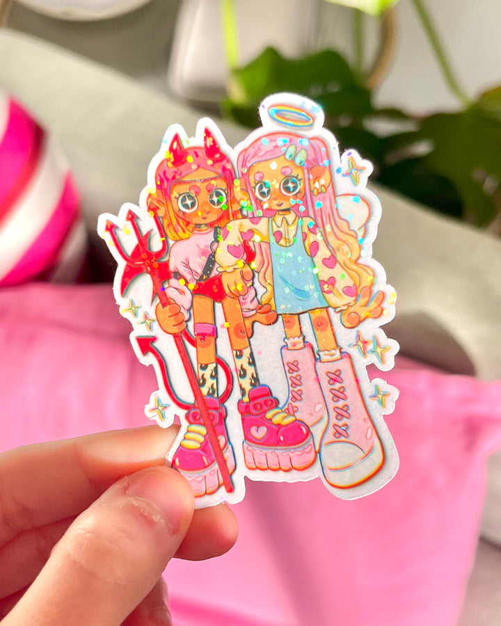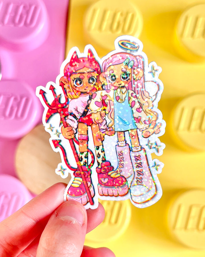 A cute Demon & Angel sticker with an holographic glitter finish :)